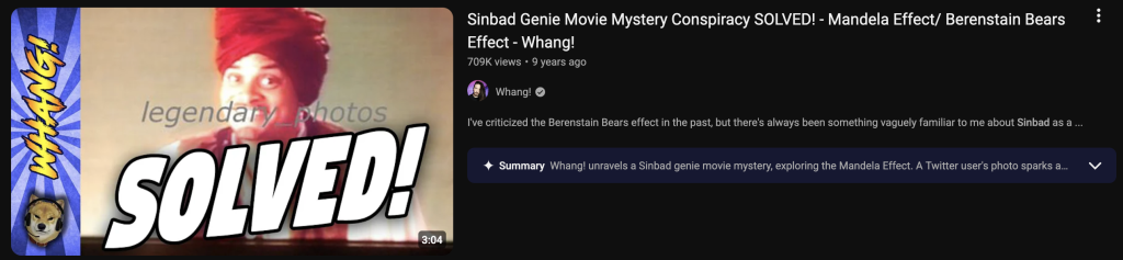 The 2017 CollegeHumor video accelerated this: When CollegeHumor released their parody with Sinbad in a genie costume, people watched it and thought: “That’s EXACTLY what I remember!” But they’re not remembering the original—they’re experiencing false recognition of a parody made 20+ years later. Look at the screenshot: Sinbad has an old man’s neck. This is 2017 Sinbad, not 1994 Sinbad. But the emotional feeling of recognition is so strong that people cite this obvious parody as “proof.”